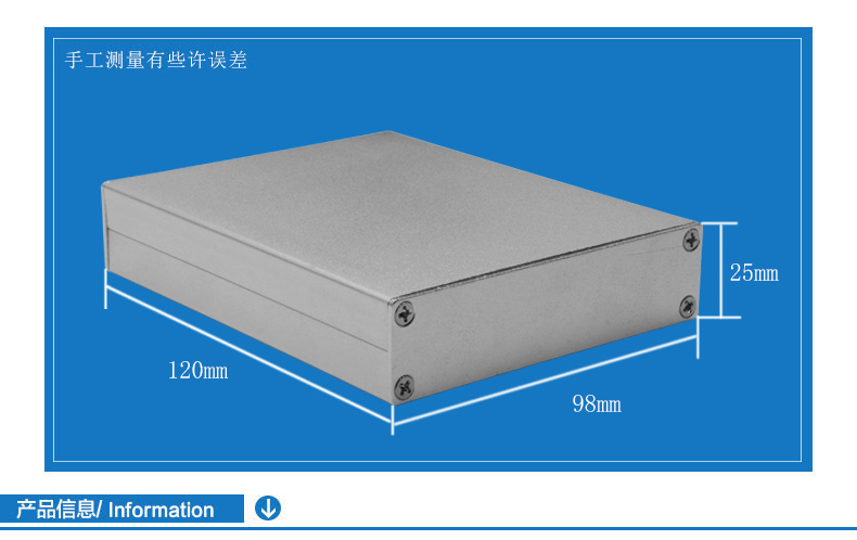 名稱:鋁型材外殼、控制器外殼、通信類外殼 表面:銀色噴砂氧化 尺寸:120*98*25mm 標品圖號:GEM-Z032-GEM01A 特點:1.全鋁材質,銀色表面,堅固耐用,卡槽固定,針對PCB板做外殼保護。 ? ? ? ? ?2.上下蓋結構,安裝拆卸方便,易操作。可用于電源盒、控制器外殼、小機箱外殼等。 其他:如需定做其他模塊外殼,請聯系客服定制。