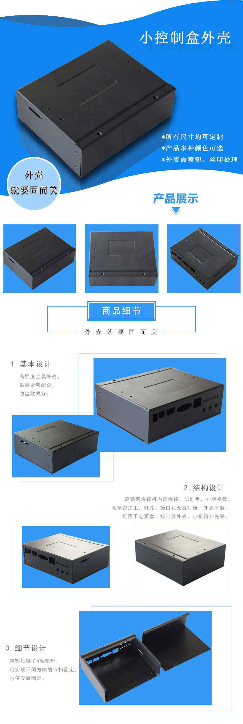 * 此款外殼適用于小控制盒外殼,繼電器外殼,電源盒外殼定制加工,車載模塊外殼,工控系統外殼,來圖來樣設計