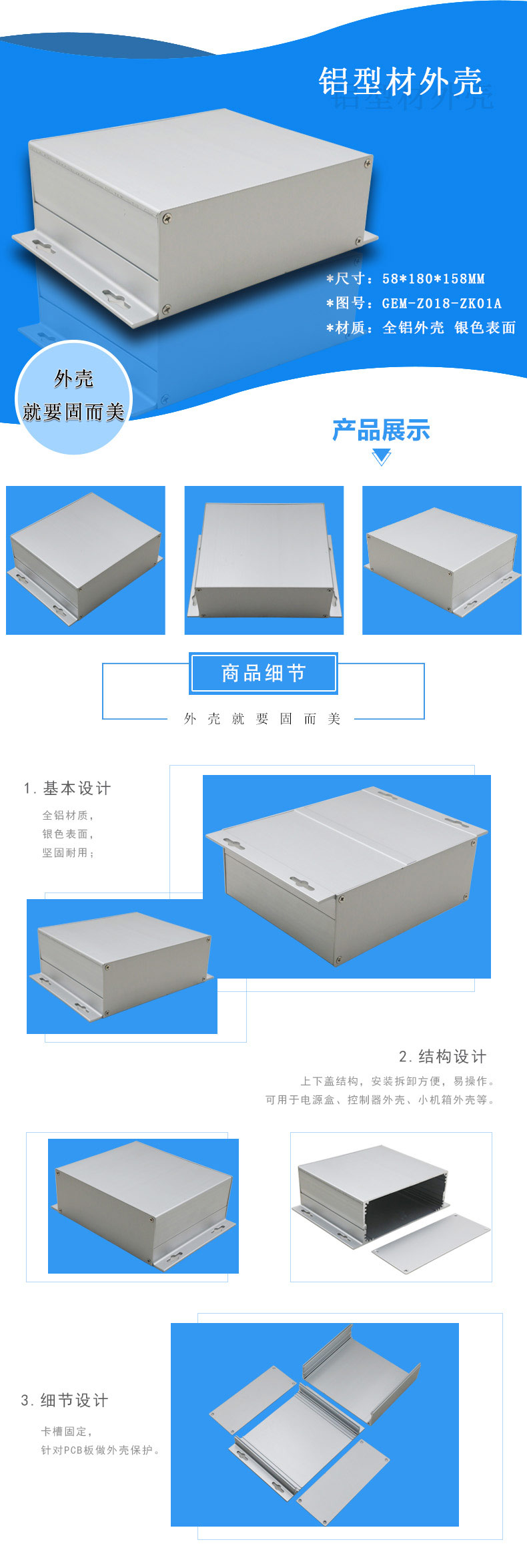 特點(diǎn):1.全鋁材質(zhì),銀色表面,堅(jiān)固耐用,卡槽固定,針對(duì)PCB板做外殼保護(hù)。
